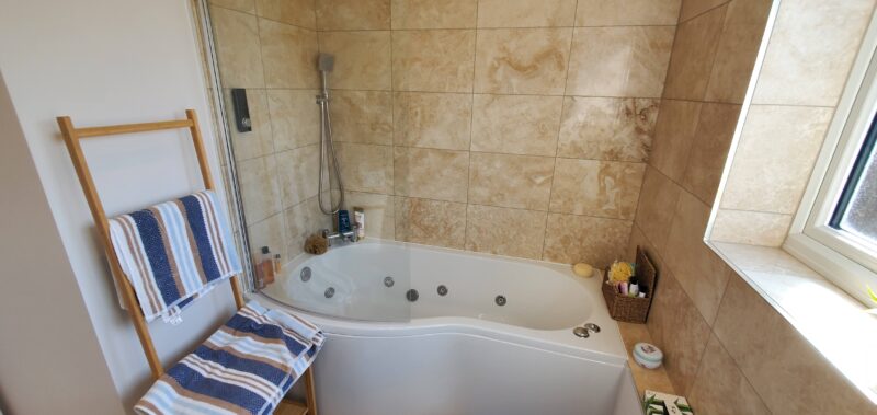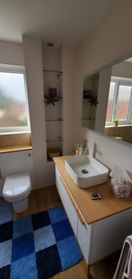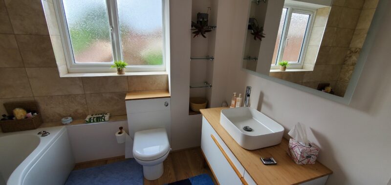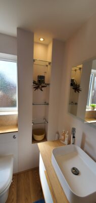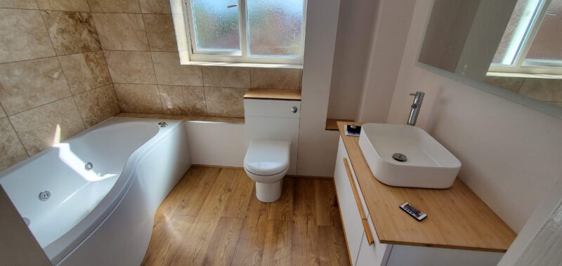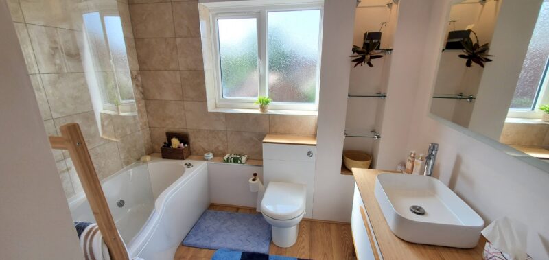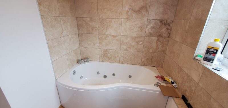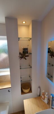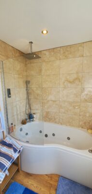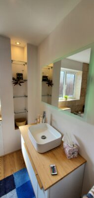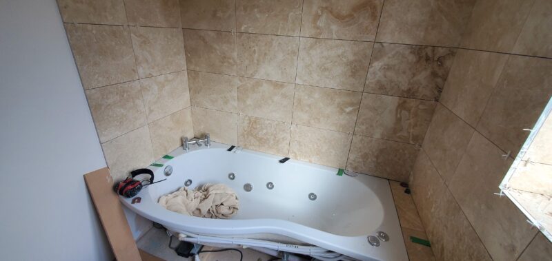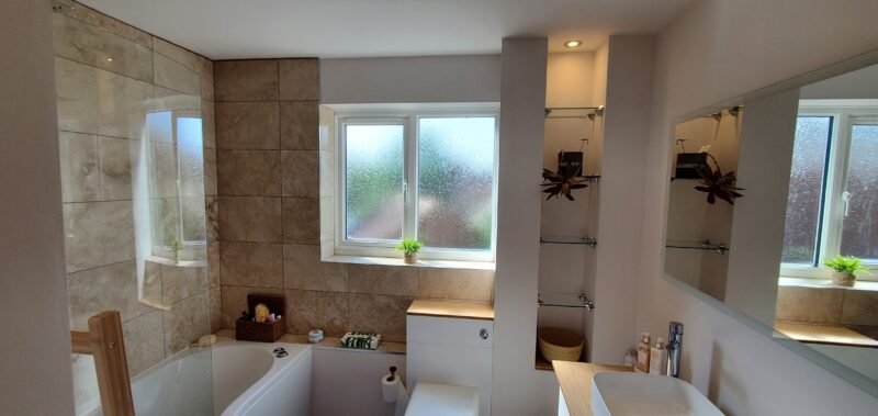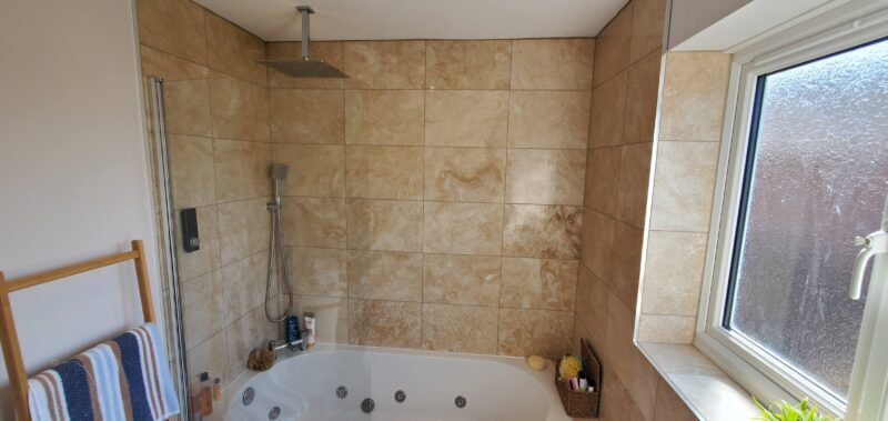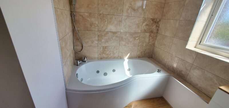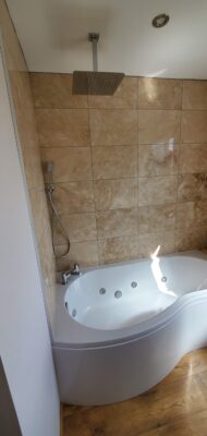The walls were insulated with straw and some of it was exposed after the tiles were removed. The room was over-boarded with moisture board and treated with Bond it. All walls and ceiling were plastered. Once dry they were mist coated and top coated. The Bathroom suite was installed to include a new sink position, as was the jacuzzi bath, Aqualisa digital shower, close coupled W.C, heated towel rail and custom glass shelves. All items connections were made and new waterproof LED downlights were cut into the ceiling and connected.
