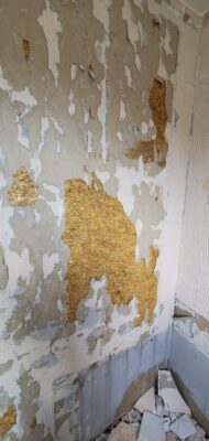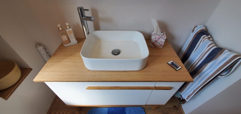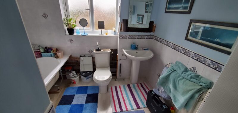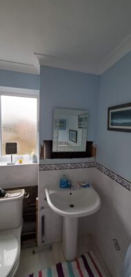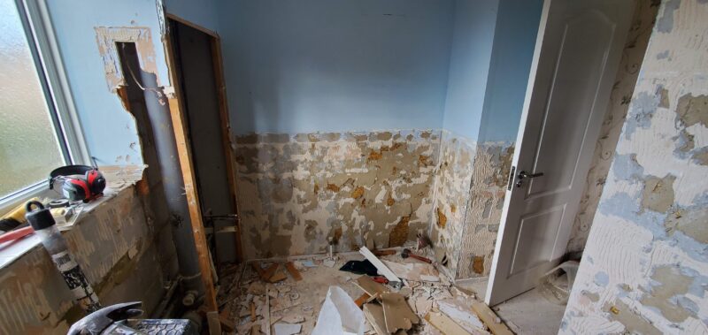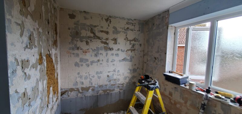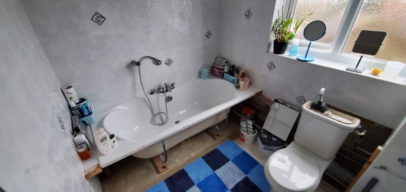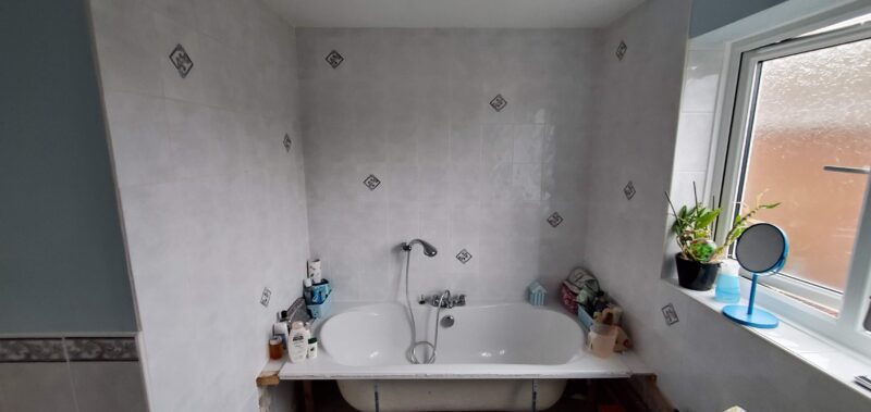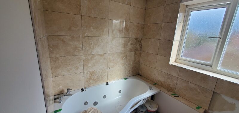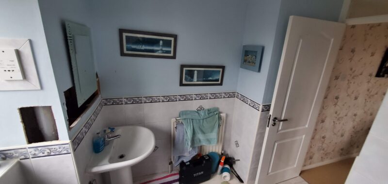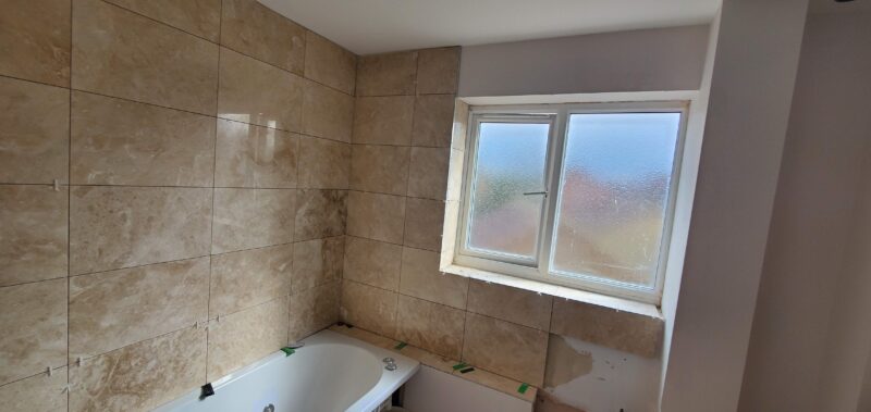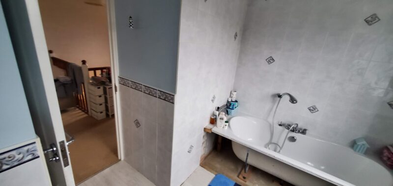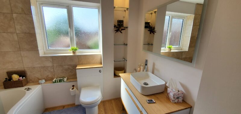 The walls were insulated with straw and some of it was exposed after the tiles were removed. The room was over-boarded with moisture board and treated with Bond it. All walls and ceiling were plastered. Once dry they were mist coated and top coated. The Bathroom suite was installed to include a new sink position, as was the jacuzzi bath, Aqualisa digital shower, close coupled W.C, heated towel rail and custom glass shelves. All items connections were made and new waterproof LED downlights were cut into the ceiling and connected.