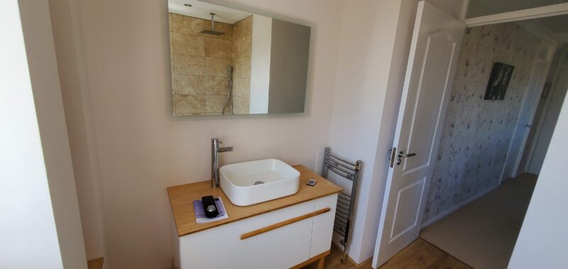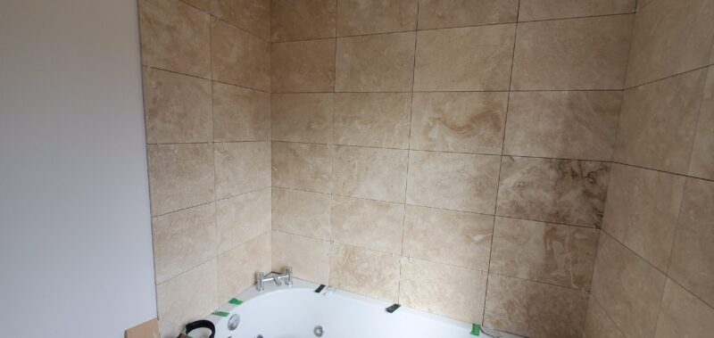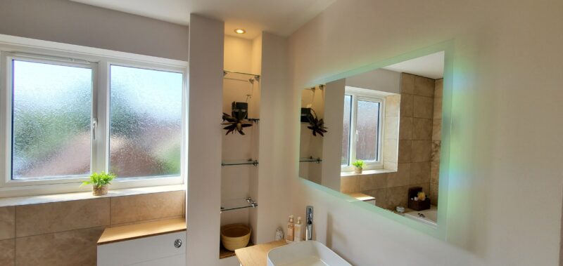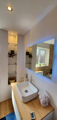 The tiles that were chosen were marble and very crumbly. Great care was taken and our exceptional tile saw did not let us down! Once the tiles had been grouted, we turned out attention to the floor which had waterproof click flooring installed. The last thing to install was the Bluetooth mirror complete with demister pad and LED lighting. Everything was tested, inspected and commissioned before handing over the new Bathroom to a delighted client!